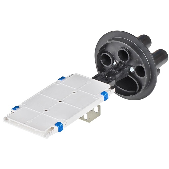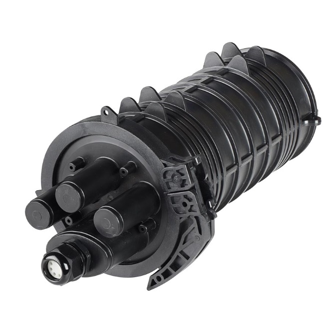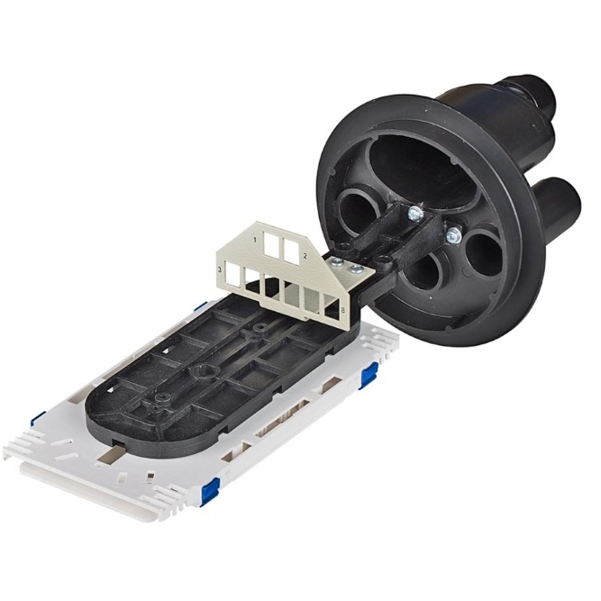 В муфте предусмотрен овальный ввод для транзитной петли оптических модулей без разрезания. Выкладка петли модулей осуществляется на лотке с противоположной стороны от кассет.