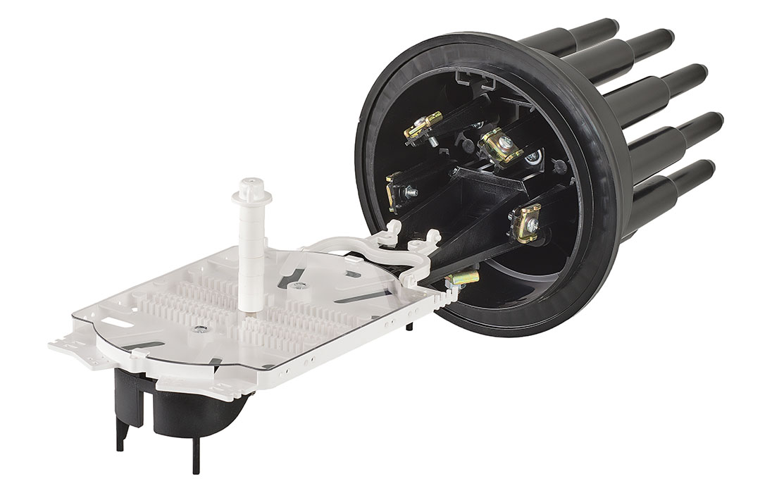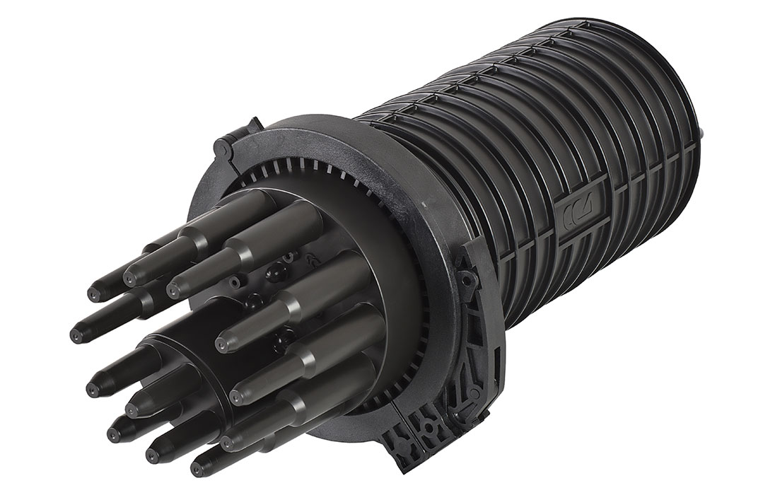 Способ герметизации вводов кабелей, осуществляется с помощью термоусаживаемых трубок ТУТ. Круглые патрубки на оголовнике муфты изначально герметичны и имеют ступенчатую форму с разными диаметрами. Срезая патрубок в определенном месте можно подобрать отверстие максимально близкое к диаметру вводимого кабеля. Таким образом, исключается излишнее натяжение ТУТ после усадки при вводе относительно тонких кабелей. Все патрубки муфты оснащены также индивидуальными узлами крепления ЦСЭ.