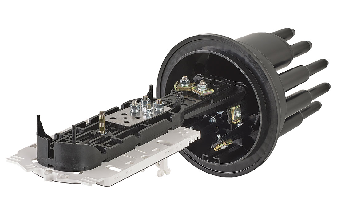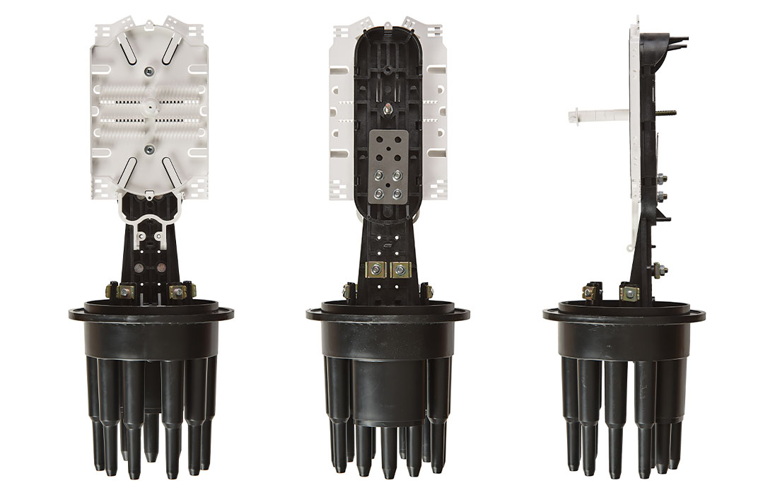 Предназначена для монтажа подвесных самонесущих ОК и оптических кабелей с вынесенным силовым элементом типа «8», а также городских кабелей любых конструкций, в том числе и с броней из стальной гофрированной ленты. В муфте предусмотрен овальный ввод для транзитной петли оптических модулей без разрезания. Выкладка петли модулей осуществляется на лотке с противоположной стороны от кассет.