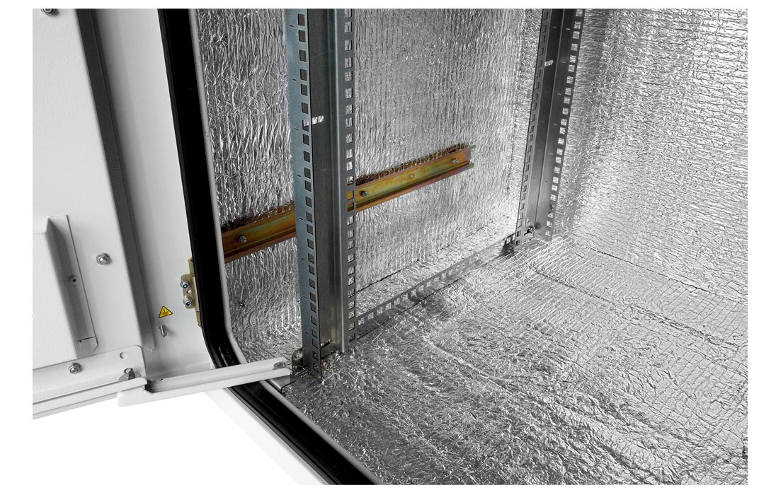 Кабельные вводы в шкафу выламываемые, расположены в днище. Внутри шкаф обклеен утеплителем.