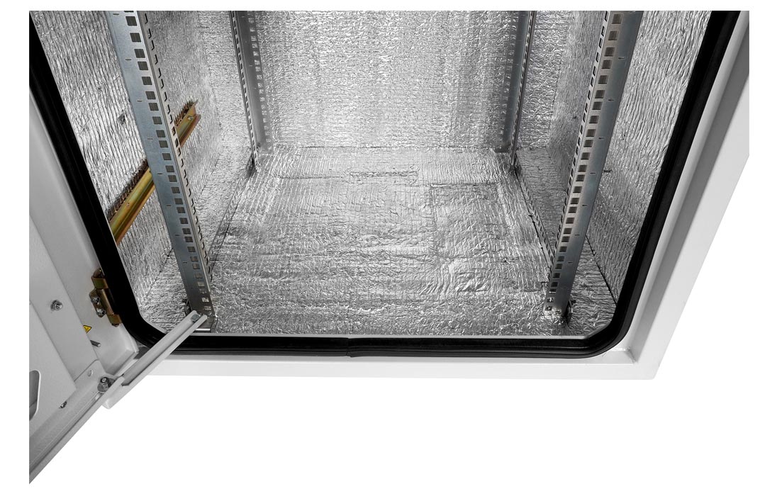Кабельные вводы в шкафу выламываемые, расположены в днище. Внутри шкаф обклеен утеплителем.