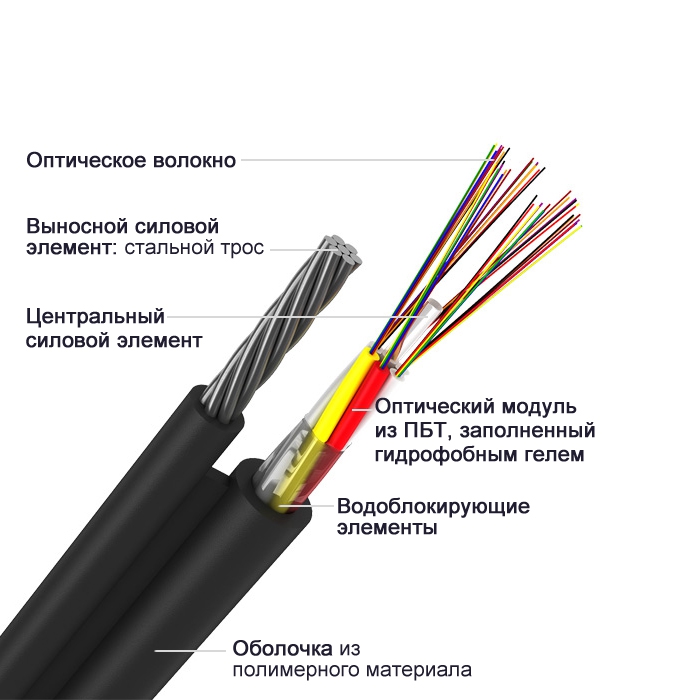 Кабели содержат центральный силовой элемент (ЦСЭ) из стеклопластика, вокруг ЦСЭ скручены оптические модули с волокнами и кордели, поверх скрученного сердечника наложена наружная оболочка из полиэтилена в виде восьмерки.
