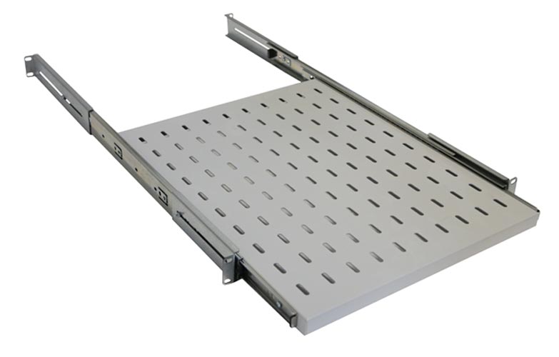 Полка выполнена из металл 1,5 мм, имеет телескопические направляющие, обеспечивающие плавное выдвижение. Монтажные кронштейны фиксируют полку к вертикальным направляющим шкафов и стоек в четырех местах. Глубина монтажных кронштейнов регулируется, что позволяет устанавливать полку на необходимую глубину. Распределительная нагрузка на полку составляет 30 кг.
