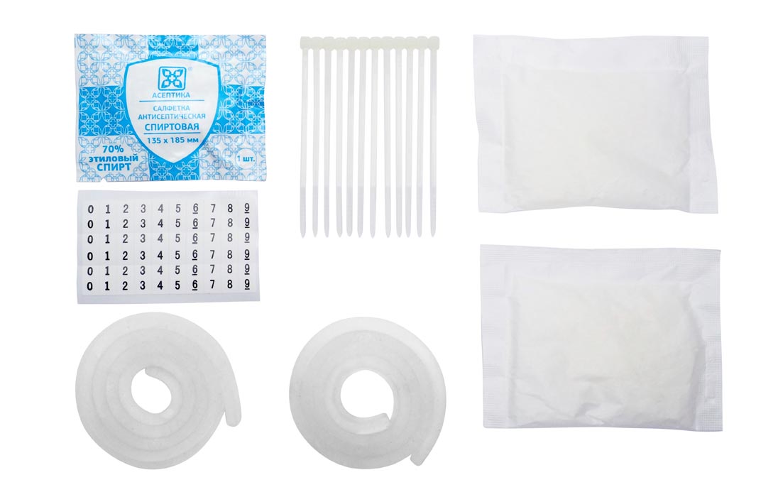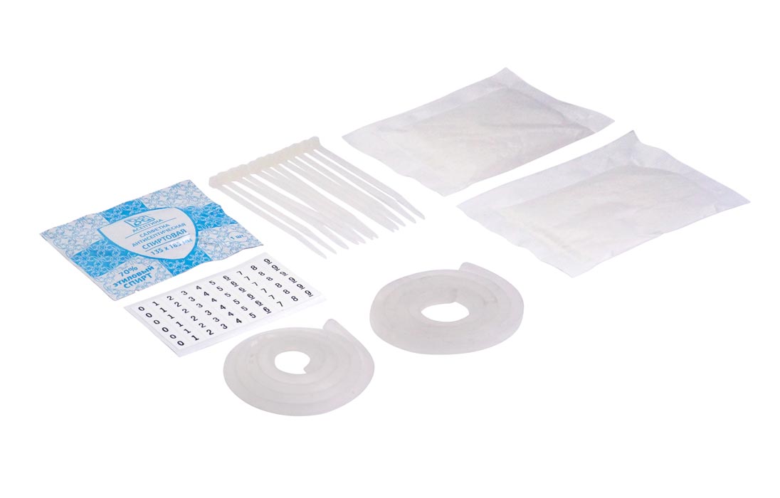 В комплект входит уплотнительный шнур, устанавливаемый на оголовник, маркеры и стяжки, которые могут потребоваться при проведении ремонтных работ и бумажный пакет силикагеля, упакованный в дополнительный герметичный п/э пакет. Перед повторным закрытием муфты пакет с силикагелем необходимо извлечь из герметичного пакета и разместить внутри муфты.