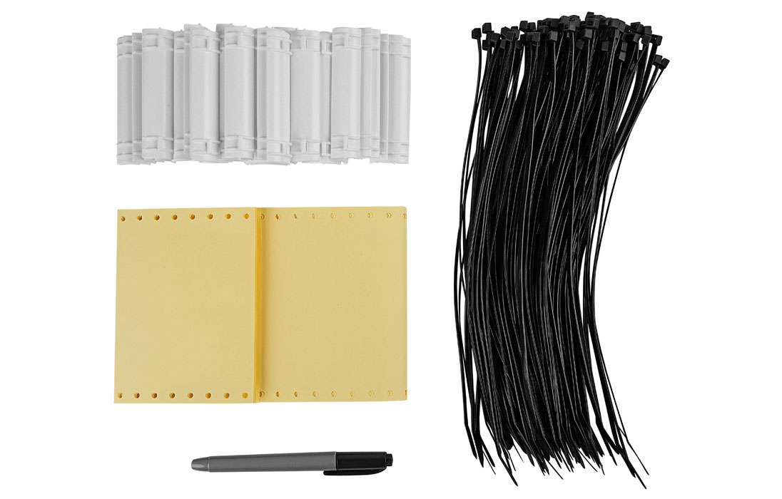 Поставляется наборами, состоящими из 20 пластмассовых бирок с проушинами, 20 самоламинирующихся маркеров для надписей, 40 пластмассовых стяжек длинной 250 мм и маркер-ручки перманентной для нанесения надписей.