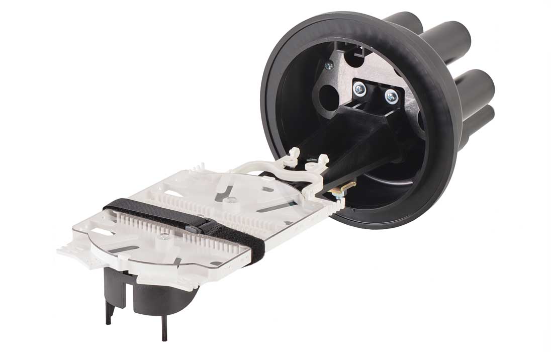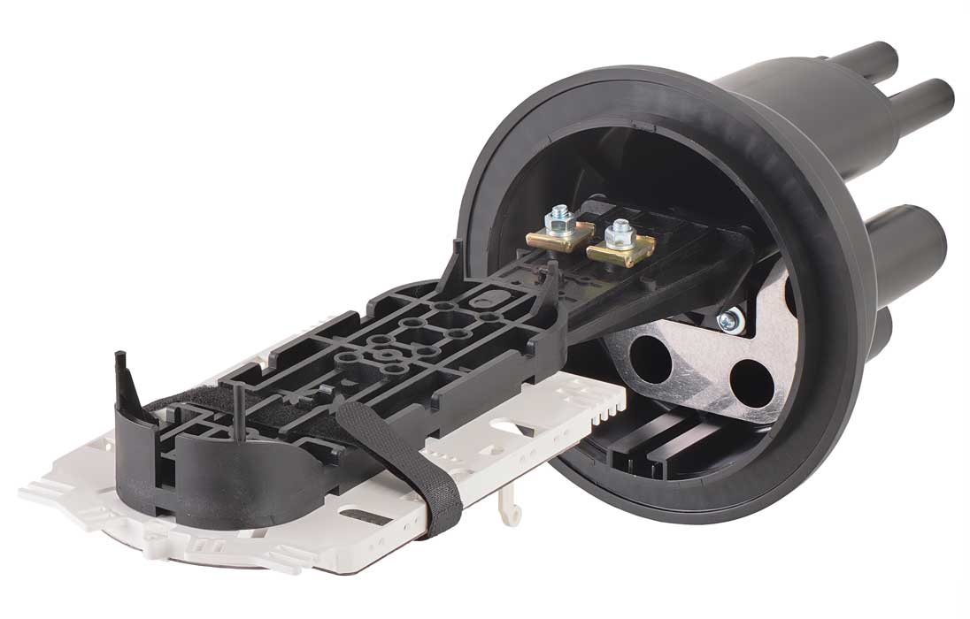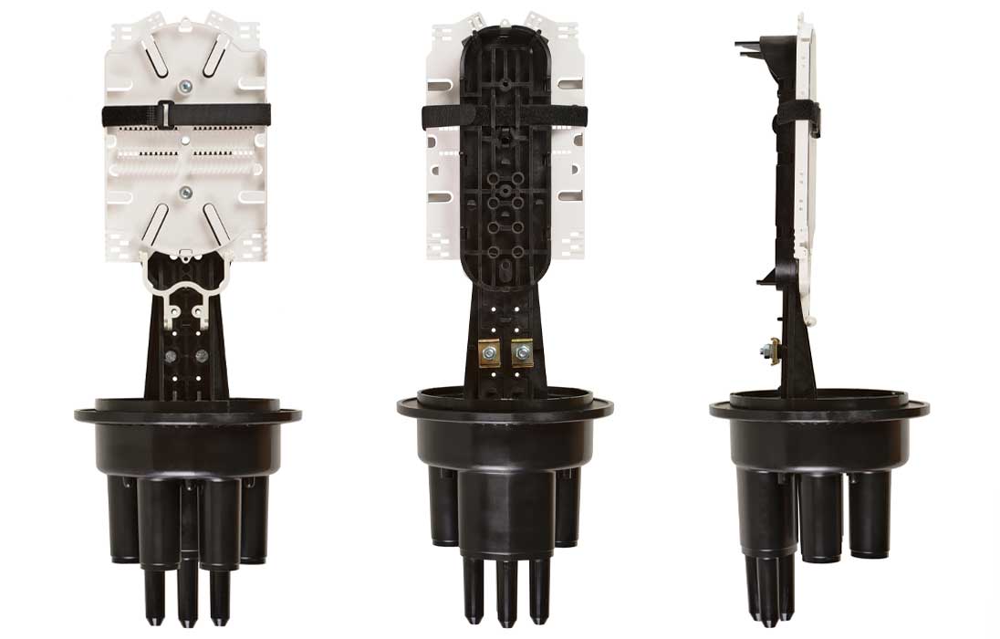 В муфте предусмотрен овальный ввод для транзитной петли оптических модулей без разрезания. Выкладка петли модулей осуществляется на лотке с противоположной стороны от кассет.