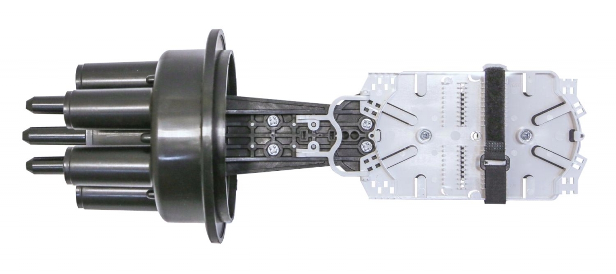 В муфте предусмотрен овальный ввод для транзитной петли оптических модулей без разрезания. Выкладка петли модулей осуществляется на лотке с противоположной стороны от кассет.