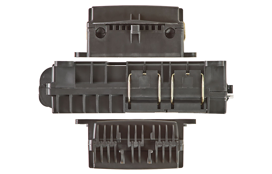 • пылезащищенный вывод до 10 дроп-кабелей круглого профиля диметром 2-3 мм или прямоугольного профиля типа «бабочка».