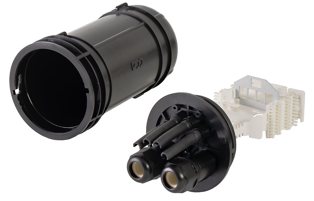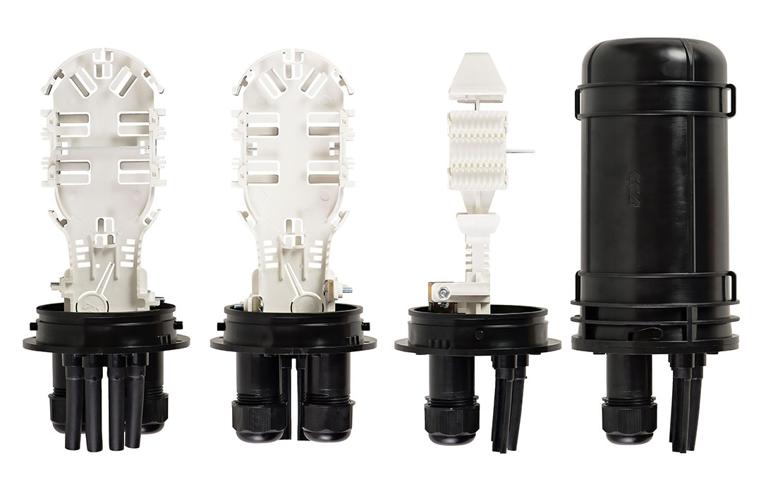Ввод абонентских дроп-кабелей осуществляется с помощью проходных отверстий на оголовнике, диаметр которых позволяют вводить в муфту дроп-кабели с разъемами SC типа. Герметизация вводов достигается с помощью разрезных эластичных втулок (заглушек).