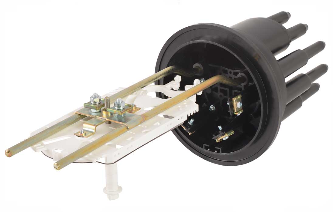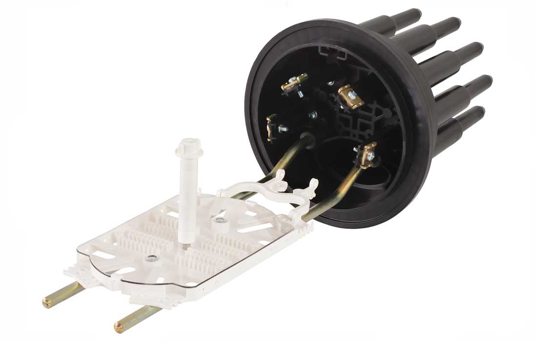 Способ герметизации вводов кабелей, осуществляется с помощью термоусаживаемых трубок ТУТ. Круглые патрубки на оголовнике муфты изначально герметичны и имеют ступенчатую форму с разными диаметрами. Срезая патрубок в определенном месте можно подобрать отверстие максимально близкое к диаметру вводимого кабеля. Таким образом, исключается излишнее натяжение ТУТ после усадки при вводе относительно тонких кабелей. Все патрубки муфты оснащены также индивидуальными узлами крепления ЦСЭ.