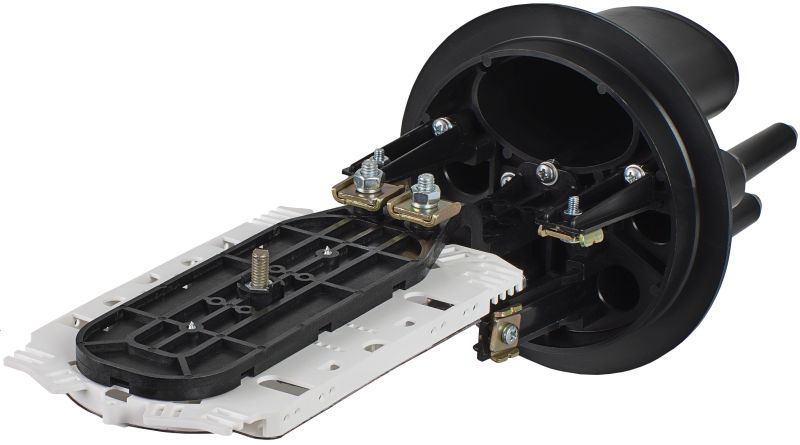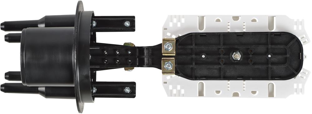 Предназначена для монтажа подвесных самонесущих ОК, оптических кабелей с вынесенным силовым элементом типа «8», а также городских кабелей любых конструкций, в том числе и с броней из стальной гофрированной ленты. В муфте предусмотрен овальный ввод для транзитной петли оптических модулей без разрезания. Выкладка петли модулей осуществляется на лотке с противоположной стороны от кассет, размер транзитной петли определяется при монтаже.
