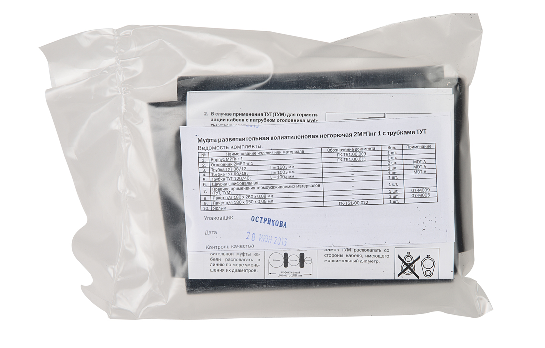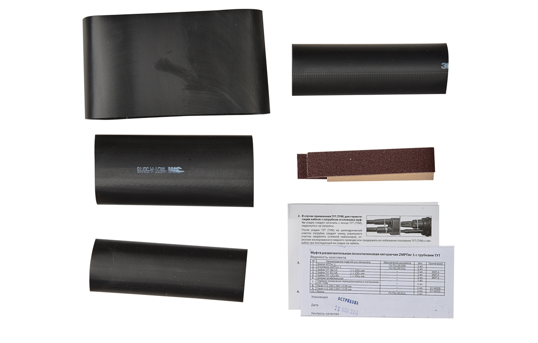 В комплект входят: корпус разветвительной полиэтиленовой муфты 2МРП 1, четыре отрезка трубок ТУТ и полоска шлифовальной шкурки. Трубки ТУТ подобраны с учётом диаметров частей муфты и диаметров оболочки кабелей типа ТП с жилами диаметром 0,5 мм.