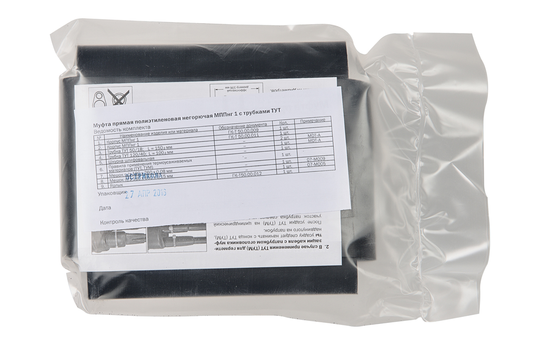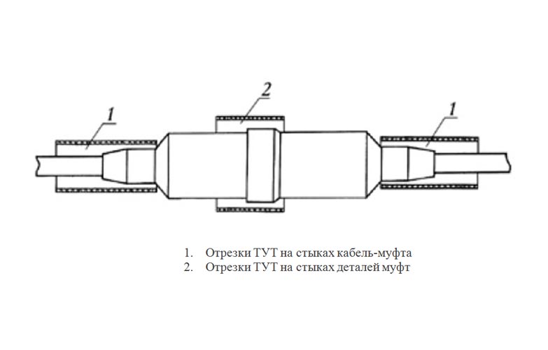 В комплект входят корпус муфты и отрезки трубок ТУТ, подобранные с учётом диаметров частей муфты и диаметров оболочек сращиваемых кабелей. Комплект позволяет выполнить только одну монтажную операцию – герметизацию муфты. Для выполнения остальных монтажных операций, таких как сращивание жил, восстановление экрана, восстановление поясной изоляции, следует дополнительно приобретать расходные материалы.