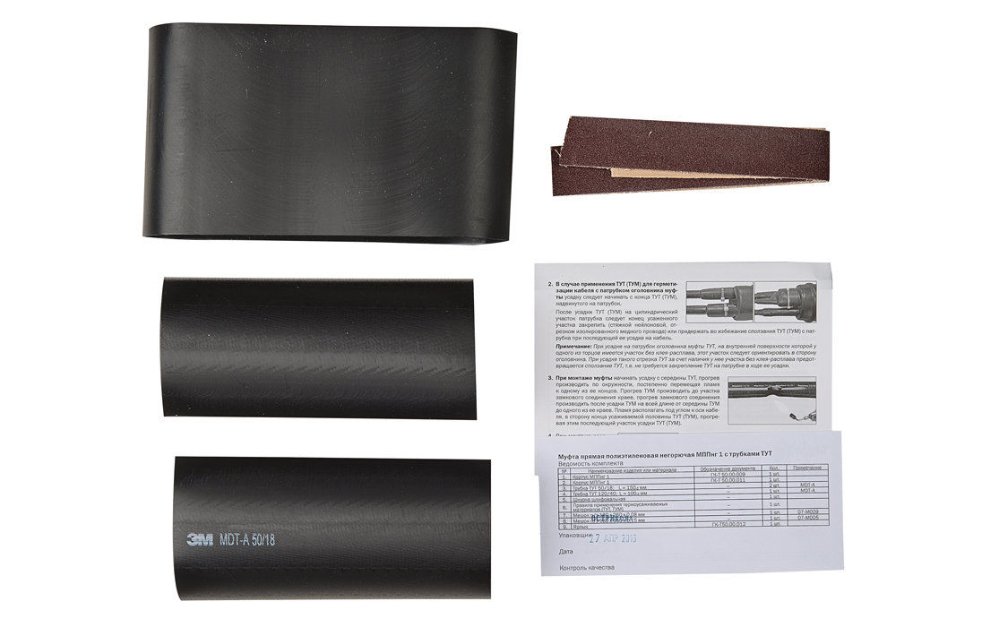 В комплект входят корпус муфты и отрезки трубок ТУТ, подобранные с учётом диаметров частей муфты и диаметров оболочек сращиваемых кабелей. Комплект позволяет выполнить только одну монтажную операцию – герметизацию муфты. Для выполнения остальных монтажных операций, таких как сращивание жил, восстановление экрана, восстановление поясной изоляции, следует дополнительно приобретать расходные материалы.