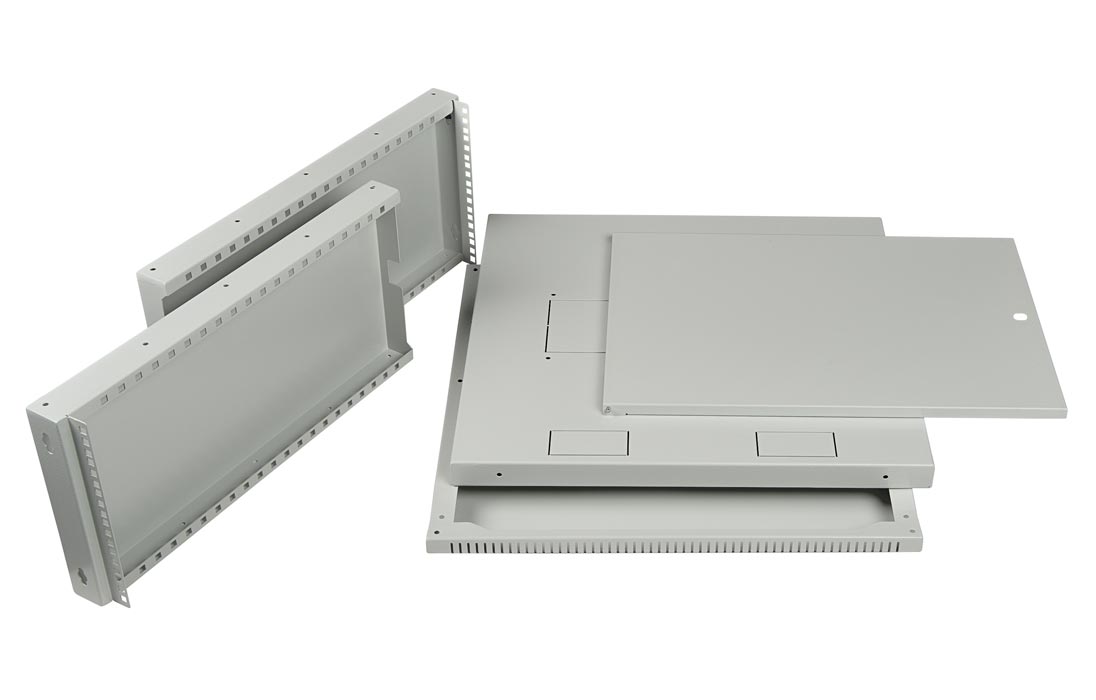 Имеет полностью разборную конструкцию и состоит из шести основных частей: крыша, дно, две боковые стенки с вертикальными направляющими, дверь, задняя стенка* и две передние направляющие. За счет элементов крепления каркас шкафа имеет повышенную жесткость. Комплектация шкафа возможна с несколькими исполнениями двери-металлической, перфорированной и с каленым ударопрочным, тонированным стеклом. Предусмотрены два кабельных ввода в верхней и нижней частях шкафа, размер – 100х50 мм. В основание или крышу шкафа возможна установка вентиляторного модуля. Для установки модуля демонтируется заглушка, и модуль фиксируется шестью винтами. Вертикальные направляющие регулируются по глубине. Система заземления шкафа входит в стандартную комплектацию.