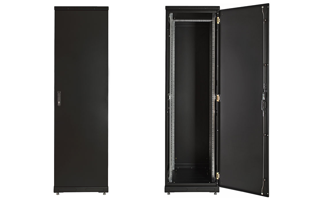 За счет элементов крепления каркас шкафа имеет повышенную жесткость. Распределенная вертикальная нагрузка до 600 кг. Стандартно шкаф комплектуется: передней дверью, боковыми и задней стенками с замками.