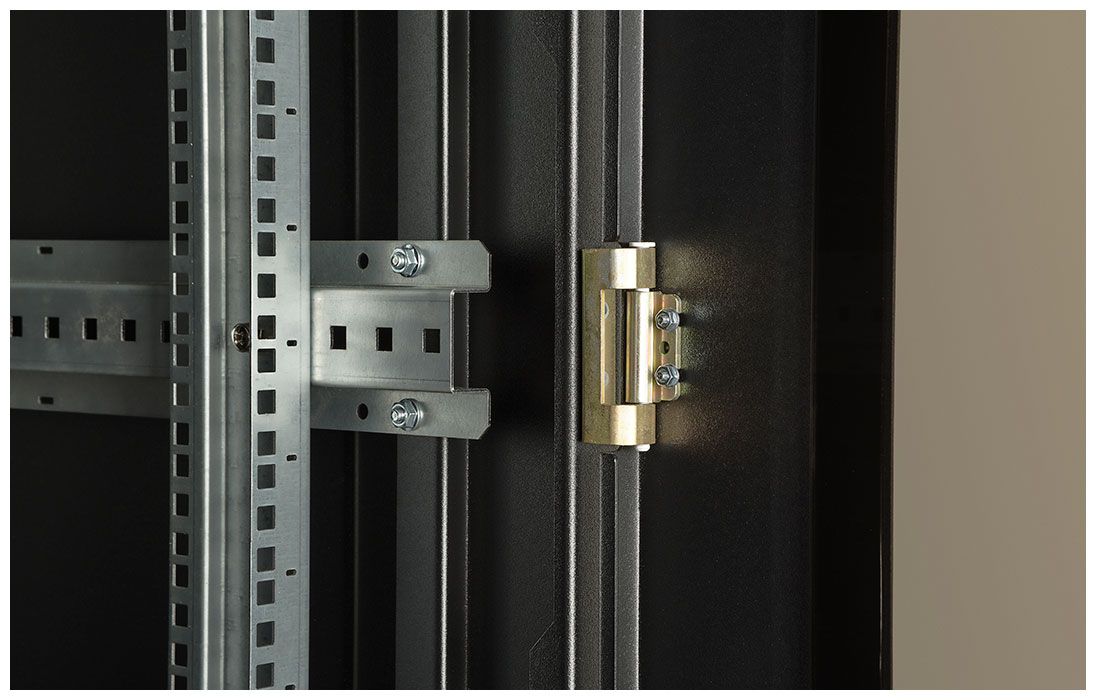 За счет элементов крепления каркас шкафа имеет повышенную жесткость. Распределенная вертикальная нагрузка до 600 кг. Стандартно шкаф комплектуется: передней дверью, боковыми и задней стенками с замками.