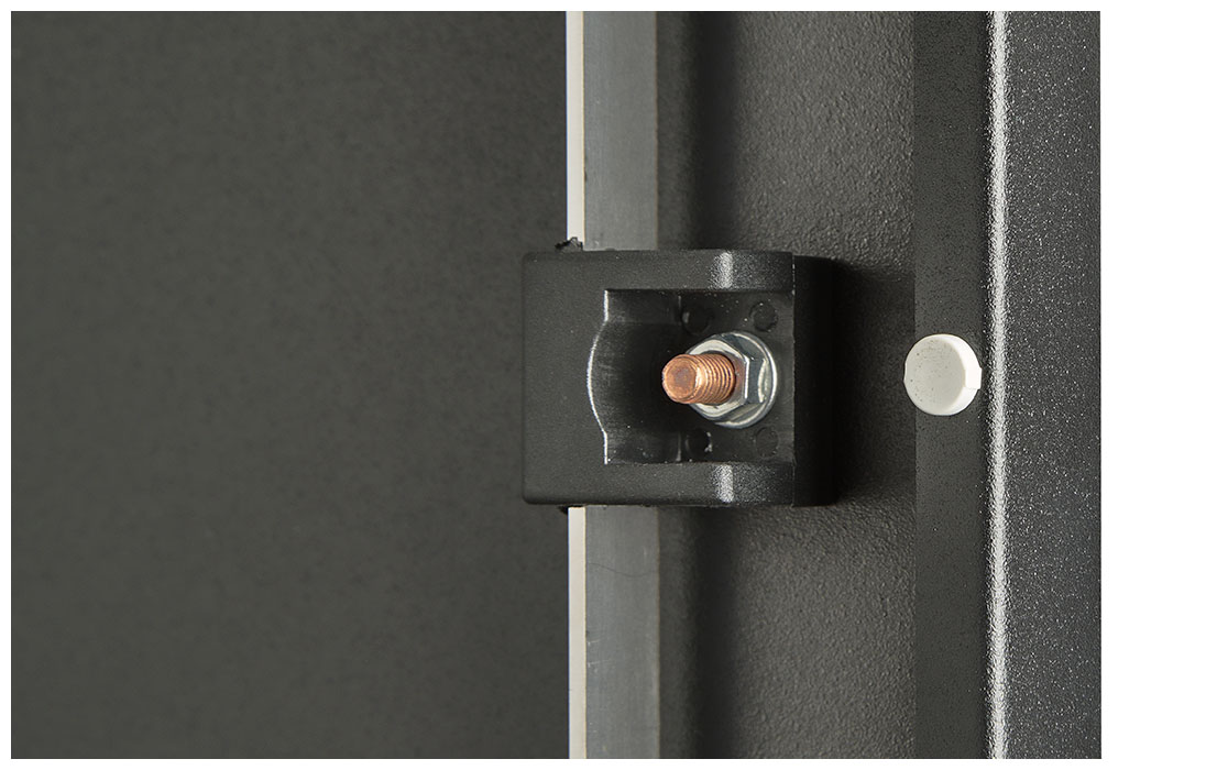 Вертикальные направляющие регулируются по глубине. Система заземления шкафа входит в стандартную комплектацию.