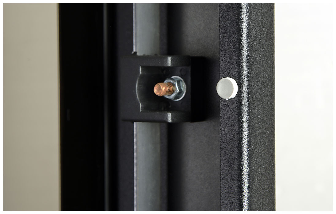 Вертикальные направляющие регулируются по глубине. Система заземления шкафа входит в стандартную комплектацию.