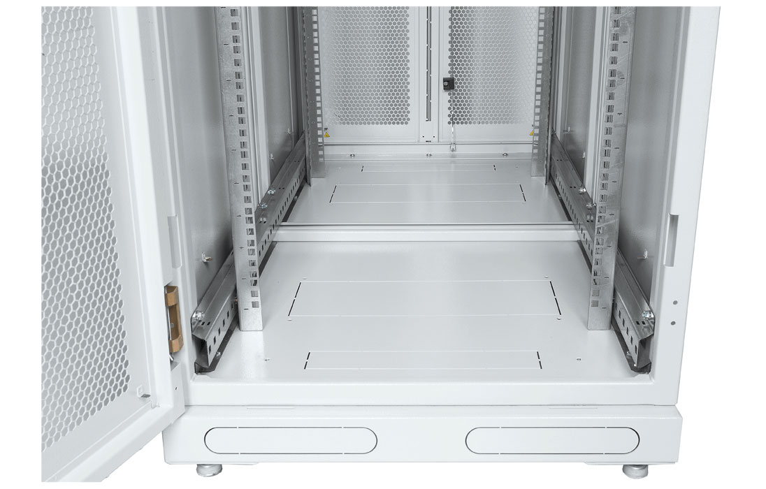 За счет элементов крепления каркас шкафа имеет повышенную жесткость. Распределенная вертикальная нагрузка до 1000 кг. Стандартно шкаф комплектуется: передней и задней дверями, боковыми стенками с замками.