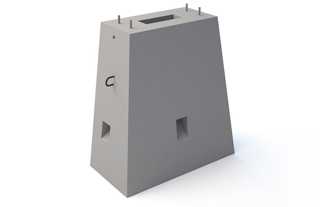 Представляет собой железобетонный блок с закладными устройствами (трубами) и четырьмя болтами на верхней площадке для крепления цоколя телекоммуникационного шкафа. Болты М16 DIN 933 выступают над поверхностью блока на 100 мм.