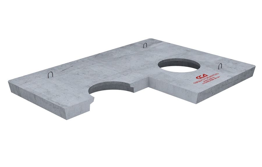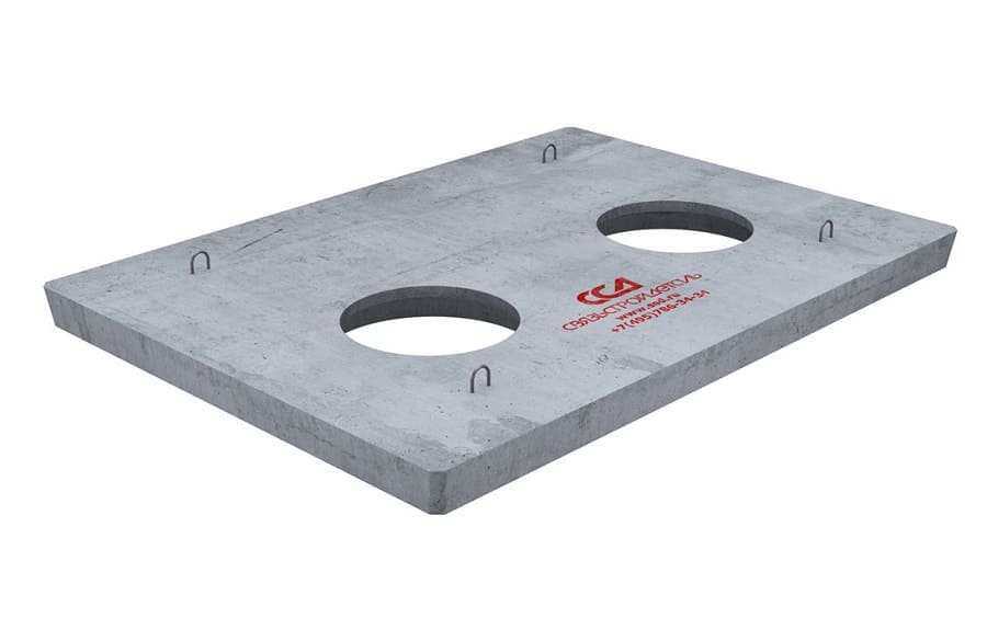 Плита имеет прямоугольную форму с двумя центрально расположенными круглым отверстием для установки люка. На верхней поверхности плиты расположены четыре строповочных петли. Отверстие снизу плиты имеет диаметр 760 мм, которое конусообразно сужается до 600 мм в верхней части плиты. Это создает возможность ввода горловин пластикового колодца внутрь отверстий плиты, с последующим размещением пластиковых крышек колодца или чехлов на горловинах колодцев для дополнительной защиты от воды и грязи. Чтобы исключить давление плиты на горловины колодца при проседании грунта после строительства, их следует вводить не более чем на треть высоты отверстия плиты.