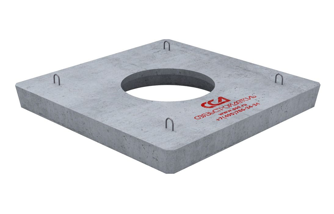Плита имеет квадратную форму. На верхней поверхности плиты расположены четыре строповочных петли. После установки пластикового колодца на плиту, производят их крепление с помощью анкерных болтов.