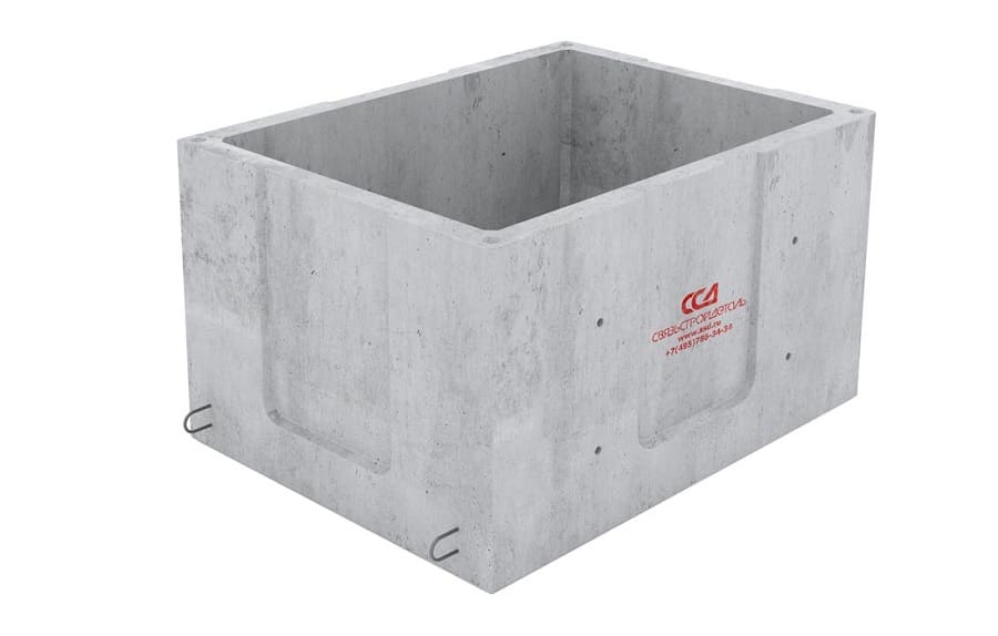 Колодец имеет в сечении прямоугольную форму и состоит из двух элементов – верхней и нижней половин. Перекрытие верхнего элемента дополнительно армировано и содержит круглое отверстие диаметром 600 мм для формирования горловины с люком. В основании нижней половины колодца с внутренней стороны расположена прямоугольная ниша. При необходимости, ее стенку вырезают для создания дренажа. На наружных поверхностях торцевых и боковых стен расположены ниши, в пределах которых можно проделывать отверстия для ввода каналов. В виду того, что стенки в нишах не имеют отверстий, это позволяет в местах строительства кабельных колодцев проделывать (высверливать) отверстия в тех местах, в которых к колодцу подходят трубы.