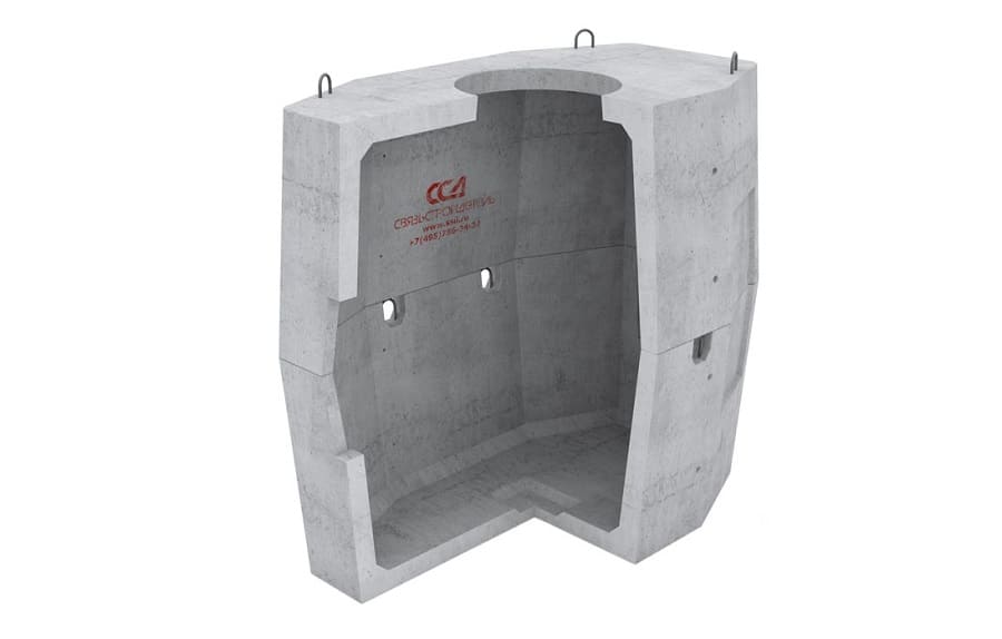 Колодец имеет в сечении трапециевидную форму и состоит из двух элементов – верхней и нижней половин. На элементах колодца имеются петли для строповки при погрузке и разгрузке их с автомобиля, а также для опускания в котлован. Перекрытие верхнего элемента дополнительно армировано и содержит круглое отверстие диаметром 600 мм для формирования горловины с люком. В основании нижней половины колодца с внутренней стороны расположена прямоугольная ниша. При необходимости, ее стенку вырезают для создания дренажа. На торцевых стенках расположены сквозные отверстия для ввода двух труб с внутренним диаметром 100 мм. На внутренних поверхностях боковых стенок имеются ниши для ввода каналов - по одной на каждой боковой стене. При необходимости, стенки ниш высверливаются или вырезаются углошлифовальной машиной того размера, который необходим для ввода соответствующего количества труб.