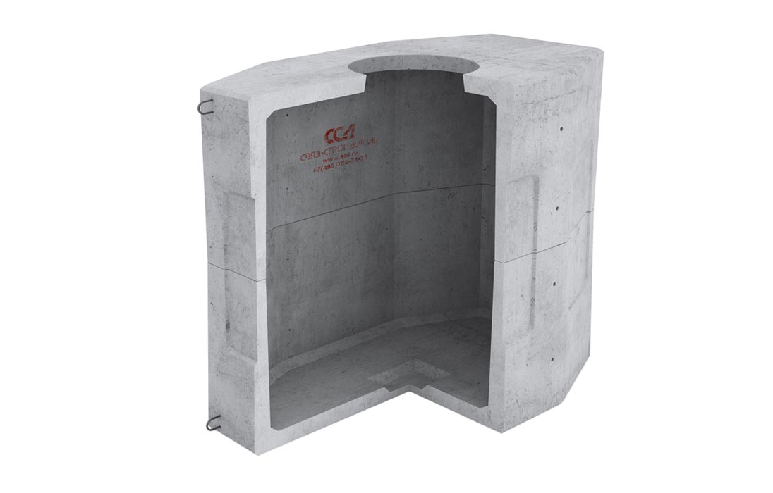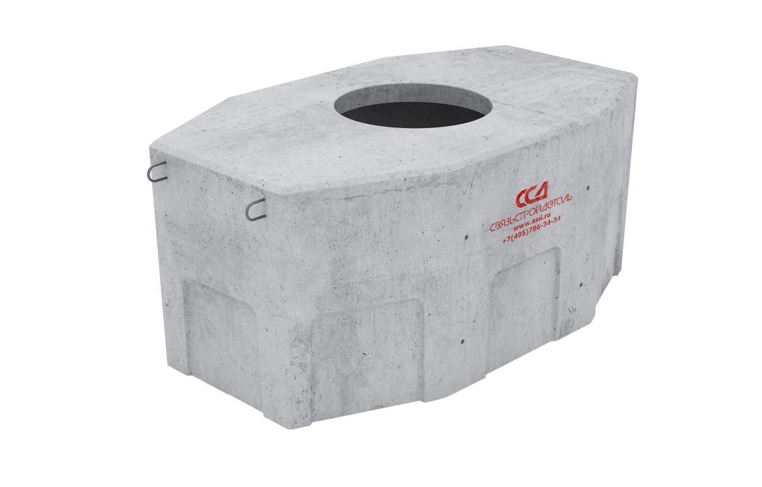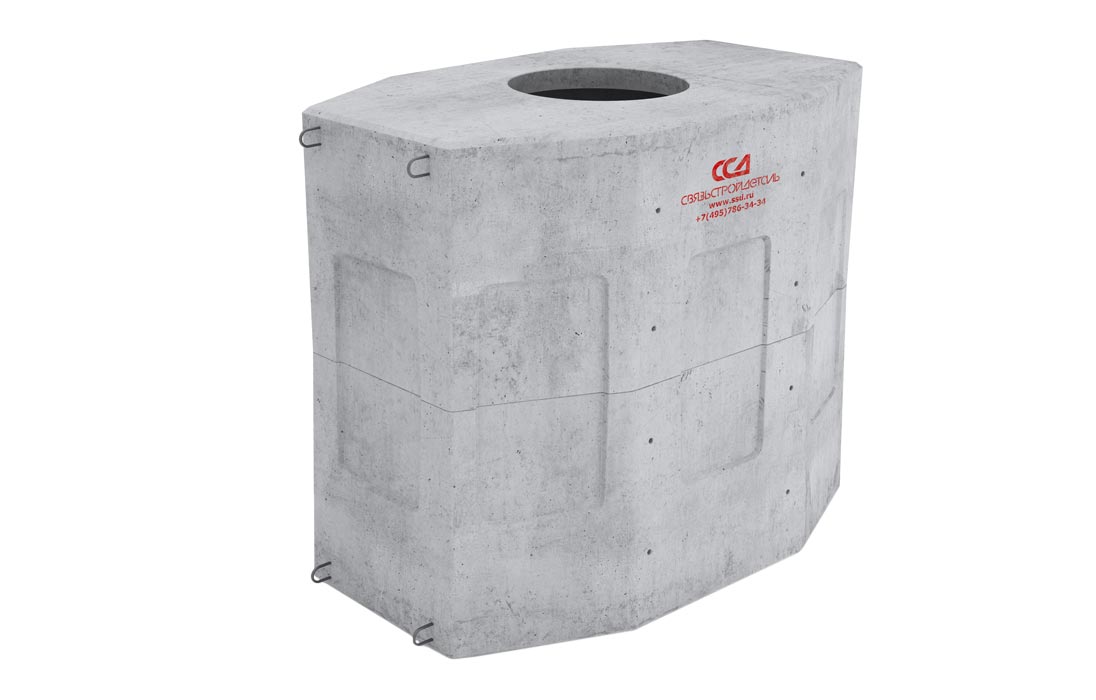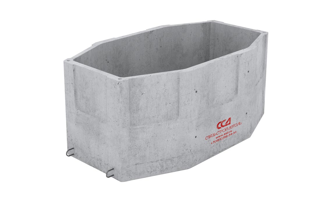 Колодец имеет в сечении восьмиугольную форму и состоит из двух элементов – верхней и нижней половин. Перекрытие верхнего элемента дополнительно армировано и содержит круглое отверстие диаметром 600 мм для формирования горловины с люком. В основании нижней половины колодца с внутренней стороны расположена прямоугольная ниша. При необходимости, ее стенку вырезают для создания дренажа. На наружных поверхностях торцевых и боковых стен расположены ниши, в пределах которых можно проделывать отверстия для ввода каналов. В виду того, что стенки в нишах не имеют отверстий, это позволяет в местах строительства кабельных колодцев проделывать (высверливать) отверстия в тех местах, в которых к колодцу подходят трубы.