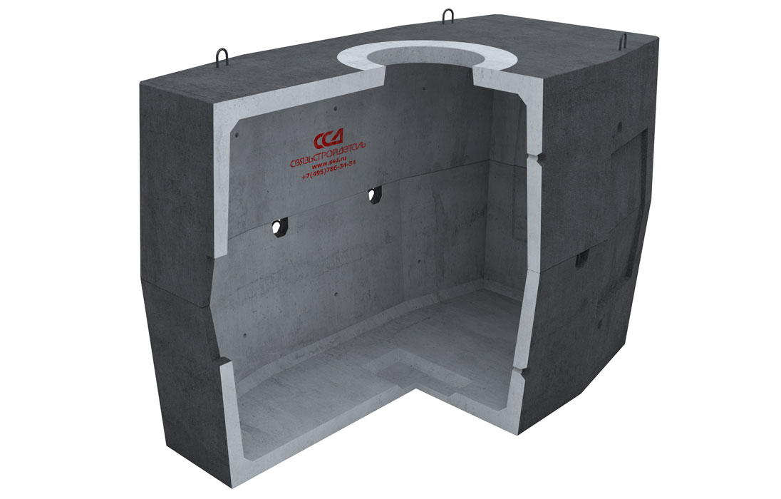 Колодец имеет в сечении восьмиугольную форму и состоит из двух элементов – верхней и нижней половин. На элементах колодца имеются петли для строповки при погрузке и разгрузке их с автомобиля, а также для опускания в котлован. Перекрытие верхнего элемента дополнительно армировано и содержит круглое отверстие диаметром 600 мм для формирования горловины с люком. В основании нижней половины колодца с внутренней стороны расположена прямоугольная ниша. При необходимости, ее стенку вырезают для создания дренажа. На внутренних поверхностях торцевых стенок элементов колодца также имеются армированные ниши. В центре ниш расположены технологические отверстия для ввода двух труб с внутренним диаметром 100 мм. Для ввода и вывода каналов на наружных поверхностях боковых стенок колодца расположены по две ниши, с каждой из сторон. Так как стенки ниш армированы, то для ввода труб в колодец необходимо вырезать отверстия углошлифовальной машиной (болгаркой) или высверливать с помощью коронок.