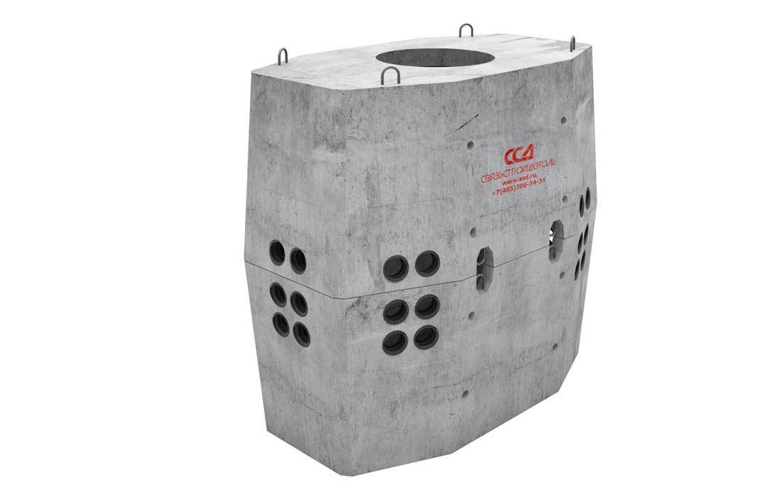 Колодец имеет в сечении восьмиугольную форму и состоит из двух элементов – верхней и нижней половин. Корпуса поставляются с вмонтированными муфтами ССД-Пайп. Перекрытие верхнего элемента дополнительно армировано и содержит круглое отверстие диаметром 600 мм для формирования горловины с люков. В основании корпуса колодца с внутренней стороны расположена прямоугольная ниша. При необходимости, ее стенку вырезают для создания дренажа. На наружных поверхностях торцевых и боковых стен расположены глухие ниши, в пределах которых монтируются муфты ССД-Пайп (количество и диаметр труб определяется согласно опросному листу).