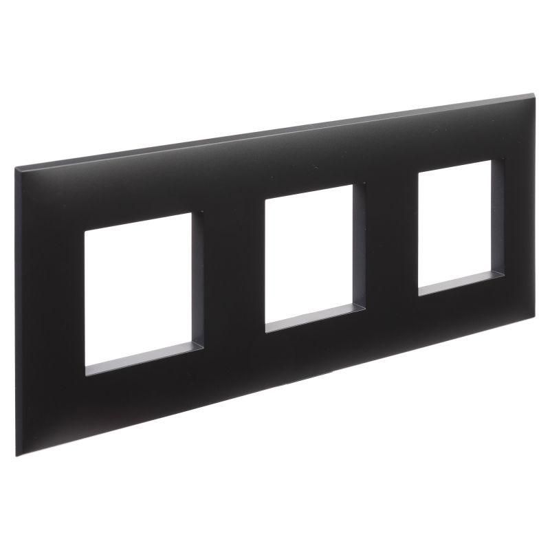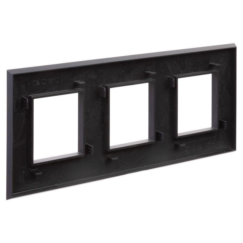 Рамки ДКС, разработанные студией Артемия Лебедева, предназначены для декоративного оформления электроустановочных изделий. Цвет рамки: "Черный матовый" - темный, манящий, приглушающий свет акцент. Отсутствие следов от прикосновений на поверхности изделий дает ощущение премиального вида в интерьере. Линейка сочетается с текстурными сдержанными покрытиями, интерьерами в различных стилях от минимализма и контемпорари до арт-деко и гранж, на стенах из необработанного кирпича в помещениях лофт. В рамке предусмотрено 3 поста под ЭУИ (6 модулей). Рамка может быть размещена как горизонтально, так и вертикально. Габаритные размеры: 230х90 мм. Материал – термопласт.