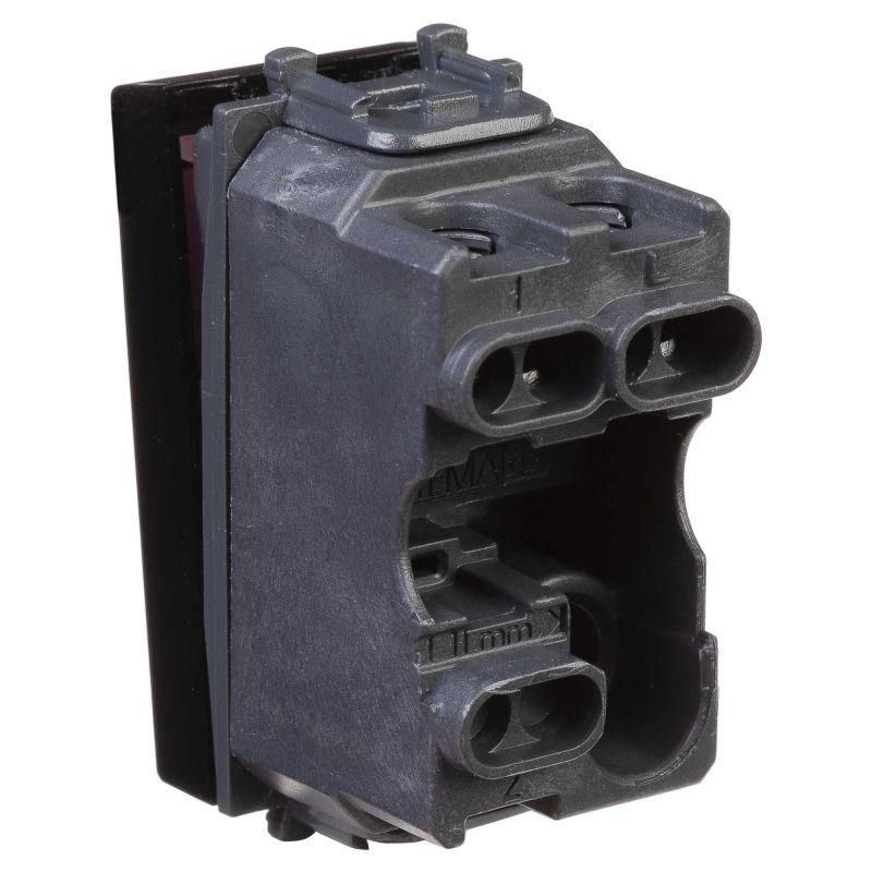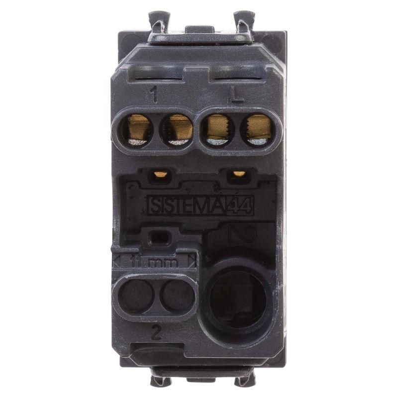 Выключатель одноклавишный однополюсный, модульный. Предназначен для монтажа в системы "In-liner Front" и "In-liner Aero" при помощи рамок-суппортов и каркасов "Avanti" (код 4400912 и т.д.); включения/выключения освещения. Характеристики: диаметр отверстий для ввода кабелей – 3 мм (по 2 отверстия на одну клемму); винтовые зажимы; шаблон для зачистки кабеля – 11 мм; номинальный ток – 16 A; номинальное напряжение – 230 В; возможна фиксация в подрозеточные коробки при помощи каркаса с лапками (код 4400802) и саморезов. 1 модуль. Цвет: "Черный квадрат".