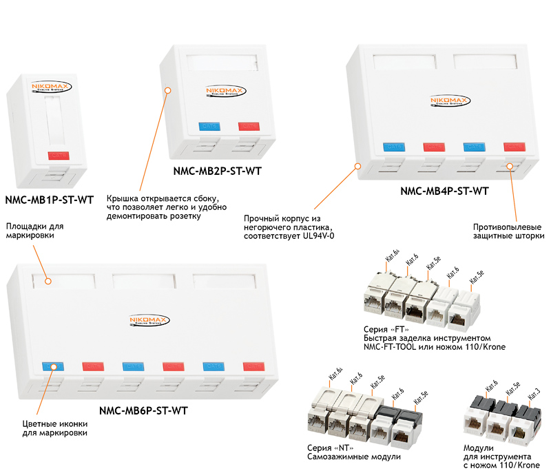 Корпуса розеток для настенного монтажа NIKOMAX – простое и удобное решение для монтажа сетей. В ассортименте имеются 4 удобные модели на 1, 2, 4 и 6 портов. Каждый порт данных розеток снабжен индивидуальной шторкой, защищающей контакты от оседания пыли.